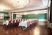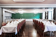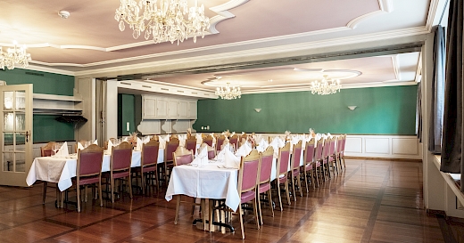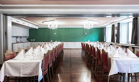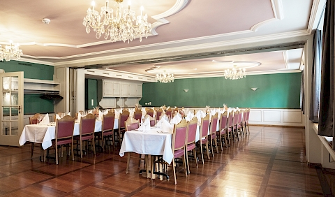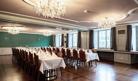 Der in grün-rosa gestaltete Saal mit wunderschönen alten Stichbildern an der Wand verströmt ein ruhiges und gemütliches Ambiente. Der renovierte Antike Holzboden sorgt für Wärme. Die breite Fensterfront zum Stadtplatz hin, lässt die Sonne eindringen und ermöglicht den Blick nach draussen. Besonders attraktiv ist ein Blocktischbestuhlung für ein Bankett für bis zu 62 Personen.