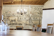 Der in grün-rosa gestaltete grosszügige Raum mit wunderschönen alten Stichbildern an der Wand verströmt ein ruhiges und gemütliches Ambiente.