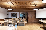 Die mittelgrosse Guisanstube mit traditionellem Ausbau in Holz in Kombination mit einer modernen Beleuchtung und den grossen Fenstern zum Stadtplatz hin, strahlt Wärme aus. Ein besonder origineller Veranstaltungsort.